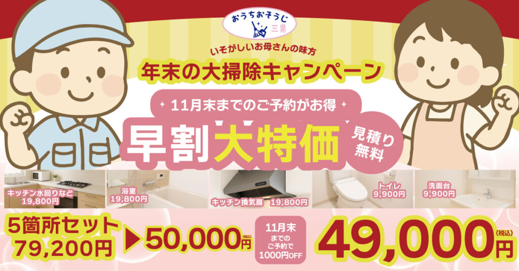 あなたの街の お掃除屋さん About おうちおそうじ三晃について お手頃価格、気軽に頼める仕上りで快適な空間づくりをお手伝いします。 「おうちおそうじ三晃では、姫路市を中心にお掃除代行サービスを提供しております。 ご自身ではなかなか手が届きにくい場所や、お忙しくてお掃除の時間が取れない方のために、経験豊富なプロの技術で丁寧にお手伝いさせていただきます。 お客様の大切な空間を心を込めて美しく整えます。真心こめたサービスをご提供いたします。 Menu メニュー 頑固な汚れから日頃お掃除できない箇所まで、高い技術を持ったプロが徹底的に綺麗にクリーニングします。 エアコンクリーニング季節の変わり目などに!高圧洗浄の力で中までスッキリ!通常エアコン ¥12,100(税込)2台目以降 半額 ¥6,050(税込) ハウスクリーニングエアコン・キッチン・水回りなど日頃忙しくて掃除に手が回らない人、落としきれないガンコな汚れをプロならではの技術で綺麗にします。 エアコン キッチン レンジフード トイレ 浴 室 ガラス・窓 セット その他 詳しくはこちら オフィスクリーニング店舗・オフィス・商業施設の清掃、定期的なオフィスクリーニングはお任せください。現地へご訪問後、お見積もりさせていただきます! エアコン キッチン レンジフード ガラス・窓 床 オフィス セット 詳しくはこちら Flow 流 れ お問い合わせからサービス開始までの流れ 1 お問合せ・ご相談 サービス内容からお掃除内容をご確認いただき、お電話またはホームページよりお問い合わせください。 お問合せはこちら 2 事前訪問ヒアリング(無料) ご依頼受付後、日程を決めてお客様のお宅へご訪問させて頂きます。現地にて調査・お見積りをさせて頂きます。 3 お見積もり・ご契約 お客様のご都合に合わせて日程調整を行い、ご契約をさせていただきます。※お見積もりにご納得いただけましたら、その場で対応させていただくことも可能です。 4 施工実施 当社スタッフがお約束の日にお伺いさせて頂き、ご依頼内容の作業を進めさせて頂きます。 5 作業完了とお支払い 作業完了後、お客様にご確認頂き、問題なければお支払いのお手続きを取らせて頂きます。 Area エリア 姫路市(家島は除く)・明石市・加古川市・高砂市・相生市・赤穂市・宍粟市・たつの市・加西市・加東市・小野市・三木市・稲美町・播磨町・市川町・福崎町・神河町・上郡町・太子町・佐用町※詳しくはお問い合わせください。 Blog ブログ ブログ 年末の大掃除キャンペーン✨✨ あっという間に今年も終わりが近づいて来ま... ブログ エアコンクリーニングで🎐お肌もうるおう🎁しらさぎ化粧品クリーム進呈中! こんにちは🌞おうちおそうじ三晃です!いつ... ブログ お問合せいただいた皆様へお知らせ 8月某日より、問い合わせフォームのエラー... 一覧を見る First 初めての方へ サービスエリア姫路市(家島は除く)・明石市・加古川市・高砂市・相生市・赤穂市・宍粟市・たつの市・加西市・加東市・小野市・三木市・稲美町・播磨町・市川町・福崎町・神河町・上郡町・太子町※詳しくはお問い合わせください。 料金の見積もり無料はい、無料でお見積りをさせていただきます。姫路市・加古川市・高砂市・たつの市周辺エリアでしたら、訪問見積りも可能ですので、お気軽にご相談ください。 お支払い方法現金・銀行振込に対応しております。お支払い方法については、ご予約時にご確認ください。 作業中の立ち会いについて基本的には、ご在宅での対応をお願いしておりますが、作業開始前と終了後の立ち会いのみでも問題ありません。お出かけの予定がある場合は、事前にご相談いただければ対応いたします。 ペットがいるご家庭への対応ペットがいるご家庭でも安心してご利用いただけます。ただし、作業中の安全確保のため、ペットの移動をお願いする場合があります。また、ペットに配慮した洗剤を使用することも可能です。