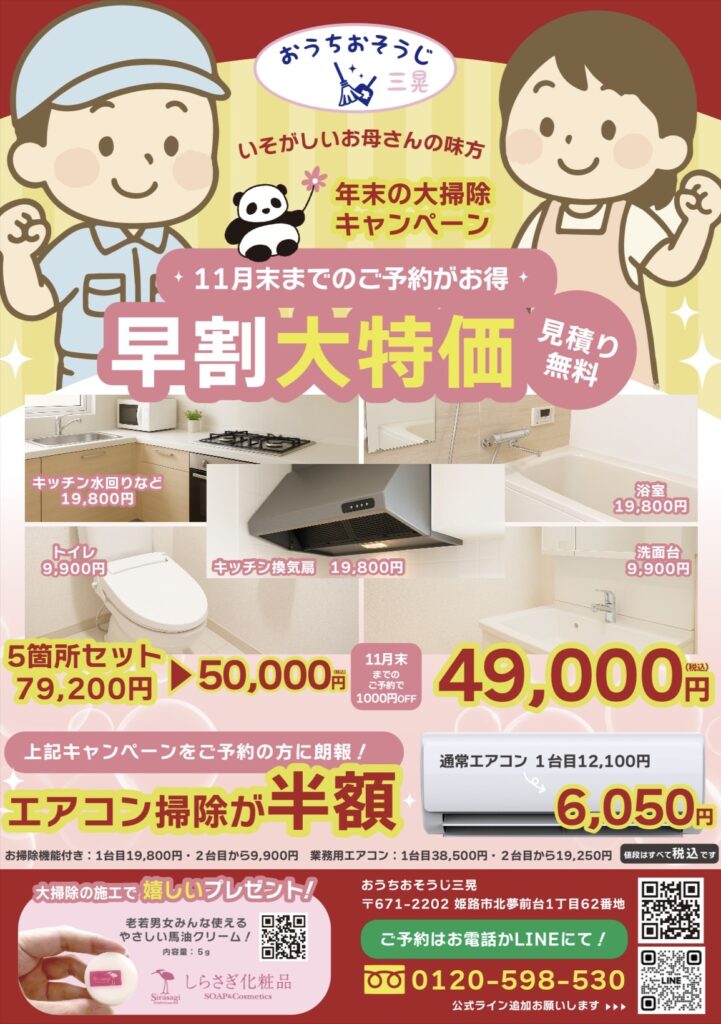 年末の大掃除キャンペーン✨✨By admin / 2025年10月29日 あっという間に今年も終わりが近づいて来ました。 年末の掃除って、忙しくてなかなかできない そんなあなたに朗報です😊 年末大掃除のキャンペーンです🎁 11月末までの予約が断然お得!! 気持ちよく新年を迎えるために早めのご予約を!!
